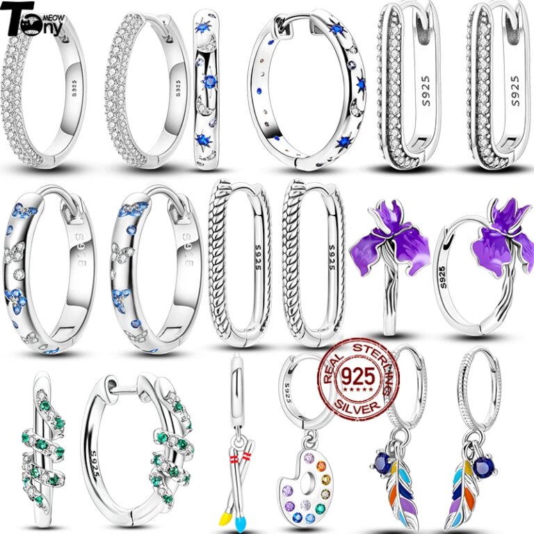 925 Sterling Silver Hoop Earrings For Women Star Moon Paint Feather Musical Note Colorful Zircon Fashion Earrings Women Gift