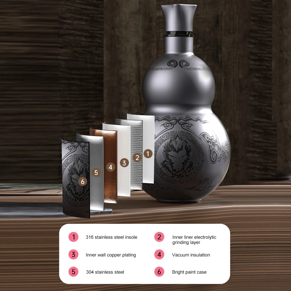 Features: 1.High-Quality Stainless Steel Material: Crafted from premium stainless steel with anti-corrosion properties, this gourd water bottle ensures safe, odor-free drinking, allowing you to enjoy pure water every sip. 2.Superior Double-Layer Vacuum Insulation: Designed with a double-layer vacuum structure, this Wu Kong water kettle provides excellent temperature retention, keeping your hot drinks warm for hours and cold drinks refreshingly chilled. 3.Unique Gourd Shape: The retro style water bottle features a fashionable gourd shape that is not only unique but also easy to grip, showcasing your personality and taste while being a highlight in your daily life. 4.Leak-Proof Seal Design: With precision sealing technology, this thermal insulation cup ensures no leaks in your bag or car, providing peace of mind and allowing you to drink freely anytime. 5.Smooth Cup Rim Design: The double-layer insulated cup boasts a smooth, rounded rim for a more comfortable drinking experience, suitable for users of all ages.Specification: Origin: Mainland China The strap is an optional accessory and can be installed by the user as needed. Main Material: 316 Stainless Steel Liner, 304 Stainless Steel Outer Shell Capacity: 500ml Size: About 18.5cm (7.28in)*9.5cm (3.74in)*9.5cm (3.74in) Net Weight: About 320g Color: Silver Gray Note: