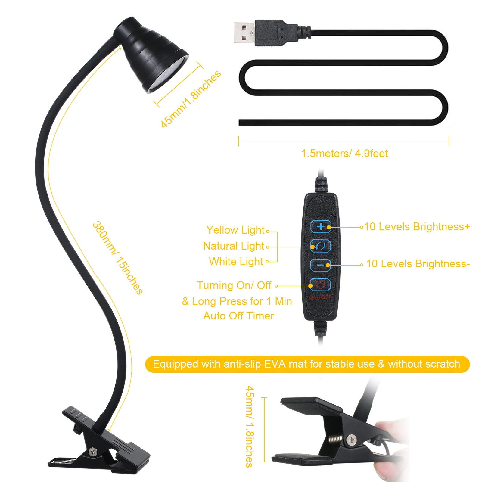 This clamp light with a stable and flexible tube which can be twisted to any positions. 3 distinctive light modes meets any different lighting requirements. Each light brightness is designed with 10 levels adjustable. Comes with compact and classic shape design, it not only function as a desk reading lamp, but also a modern decoration for you.
