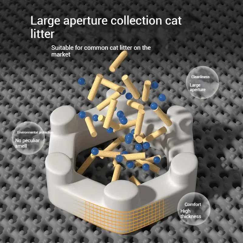 The cushion is very suitable for catching cat litter and for delicate claws. Â Our soft EVA material is very gentle to sensitive cat claws. Â Cats even like to step on it or take a nap in the afternoon. Â The double layer design can filter the cat litter and gather it at the bottom. Â Shake gently to release the litter.