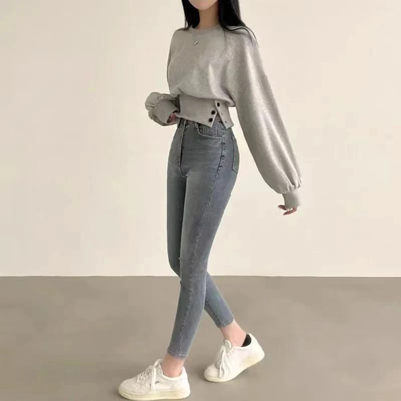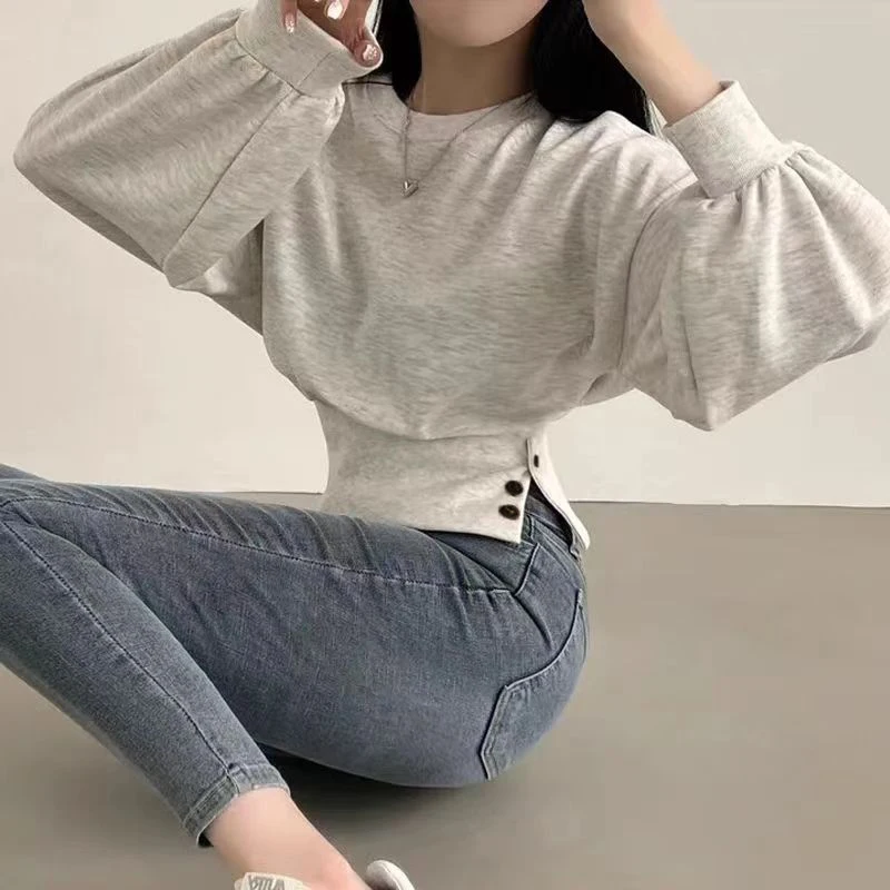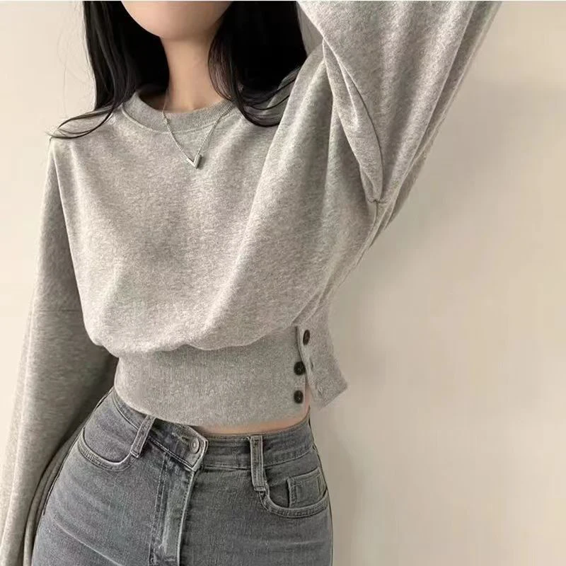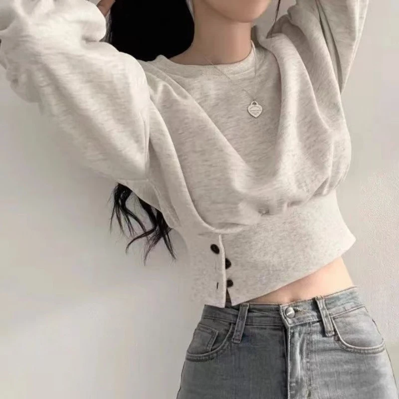 Casual Hip-Hop Sporty Pullover Sweet Chic Street Wear Autumn Women Solid O-Neck Slim Crop Top Lantern Sleeve With Button Sweat