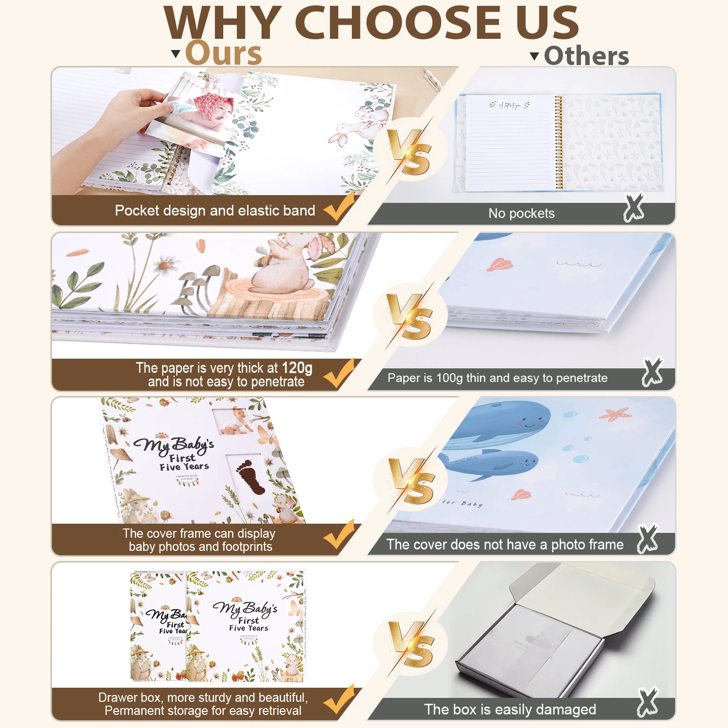Structured Classical Theme:The memory book is organized into six distinct chapters: Before You Were Born, Your First Week, The First Year with You, Your First Memorable Experience, Your Early Years (2-5 years), and Letters to You. Each chapter guides parents through recording their baby’s development, making it easier to capture and organize memories. This structured approach helps parents focus on specific periods of their child’s growth, ensuring no precious moment is missed.