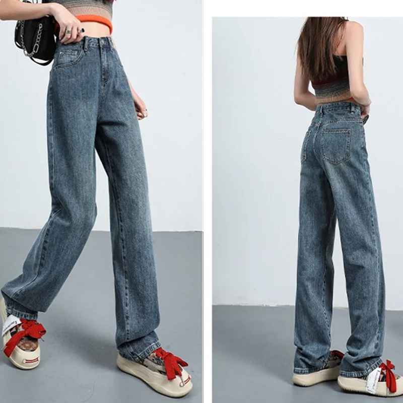 Women Retro Blue Black High Waist Wide Leg Jeans Lady Style Straight Leg Denim Pants Fashion Streetwear Daily Trousers