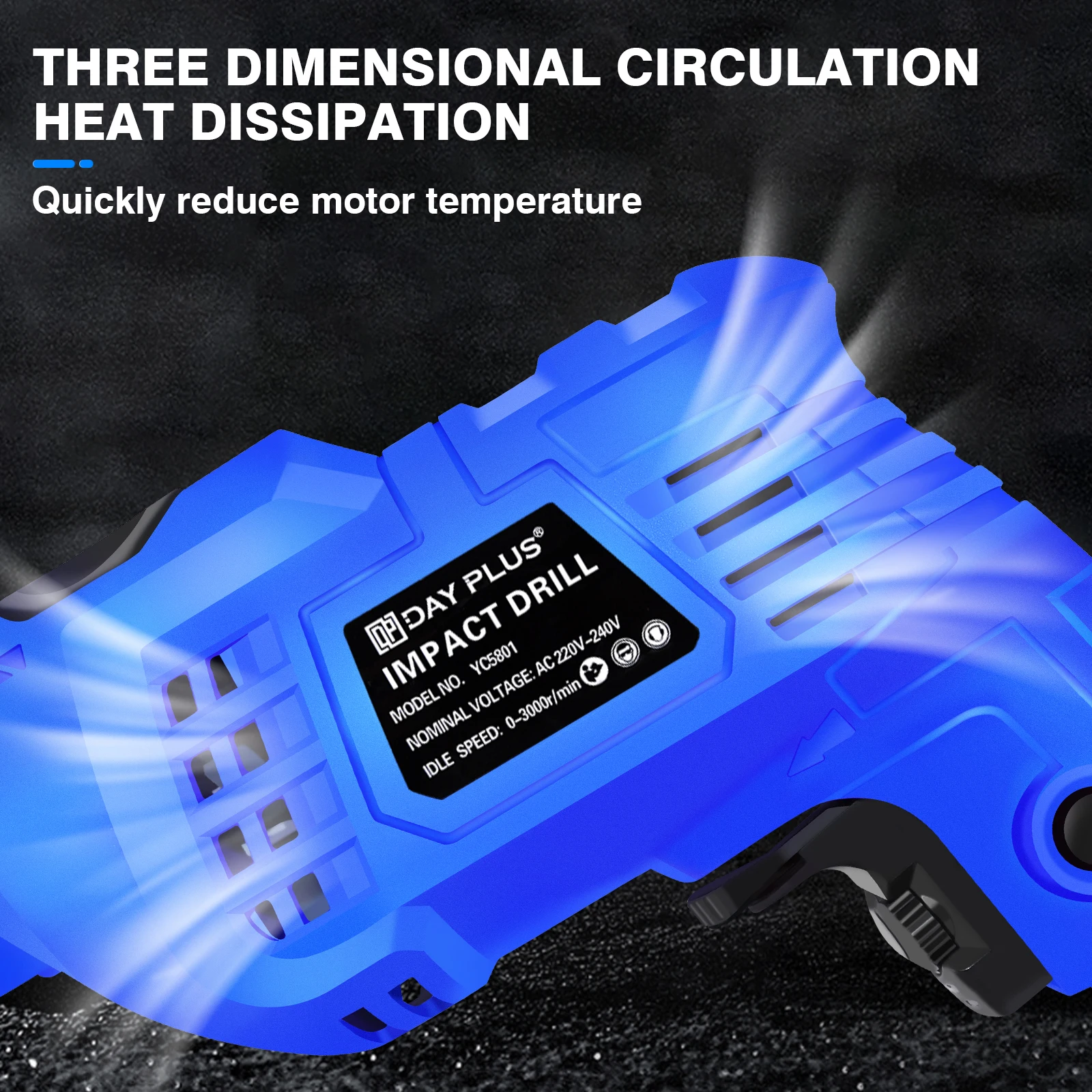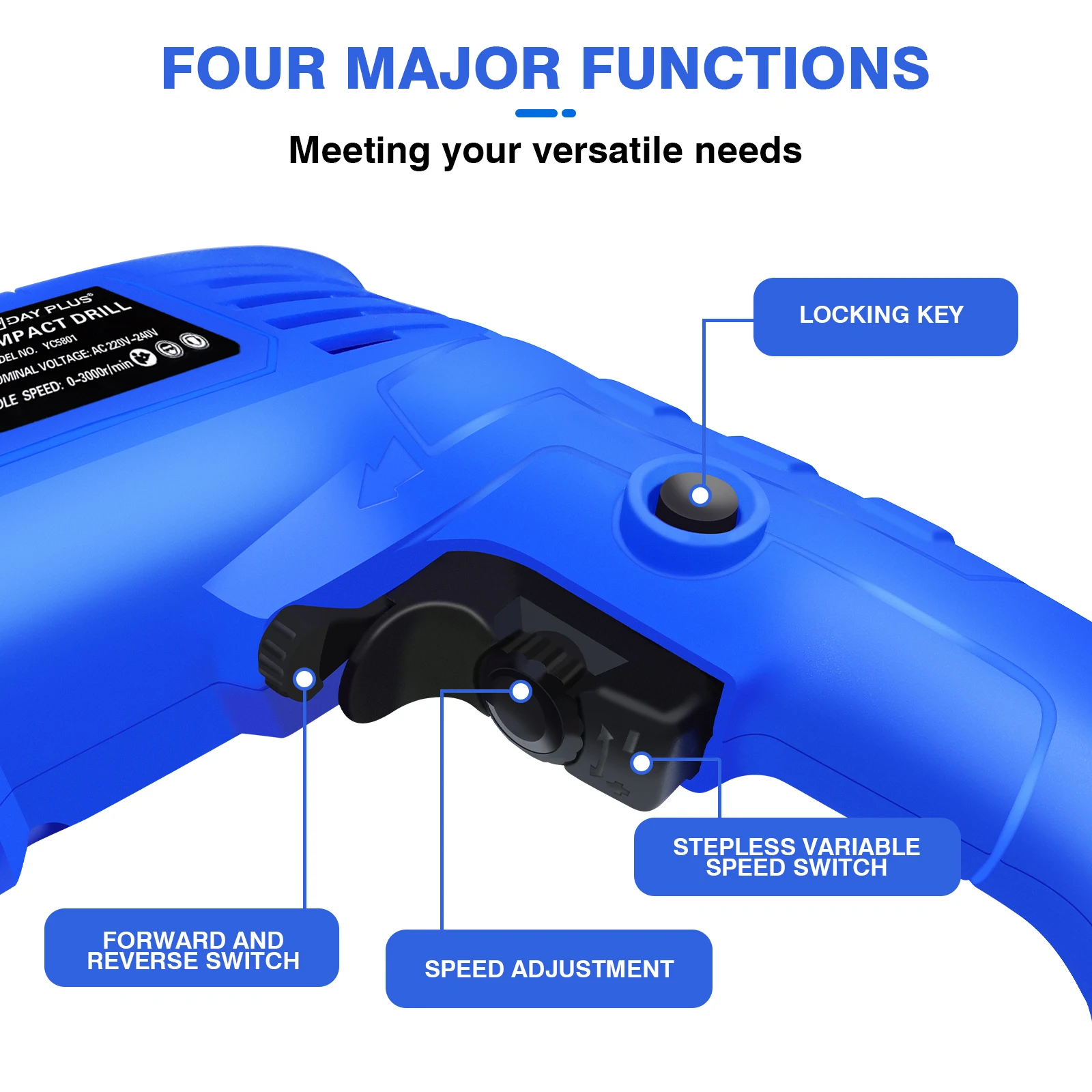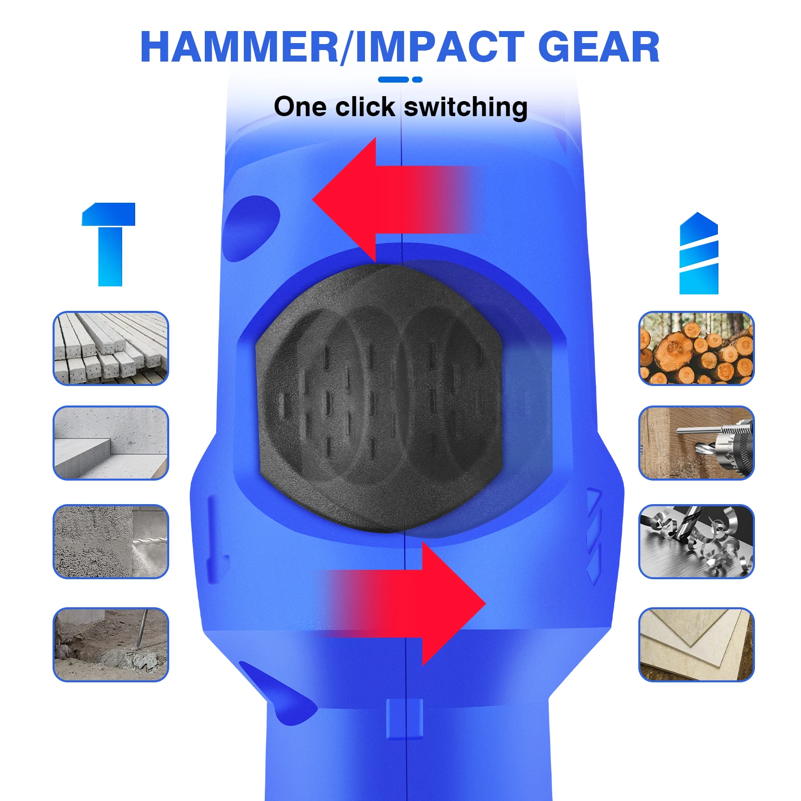 2 In 1 Hammer Impact Drill: By turning on or off a electric drill’s impact mechanism according to your task, it not only possess a drilling feature, but also works as an percussion drill that provides a rapid succession of short hammer thrusts to break through concrete, stone, wood and metal with less effort.