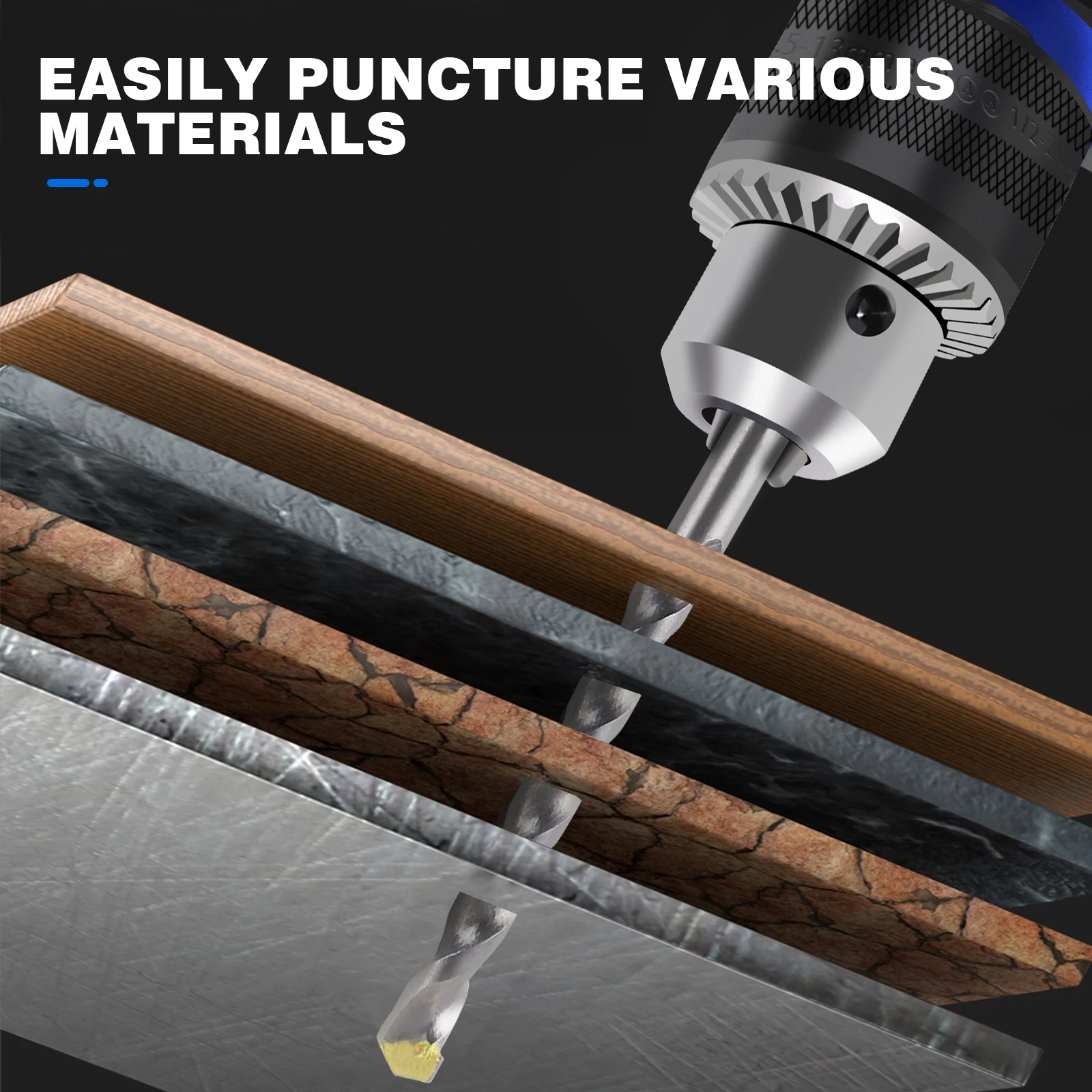 4PCS High Quality Accessories: The electric hammer drill comes with 1x Concrete drill, 1x Metal drill, 1x Wood drill, 1x Drill key.