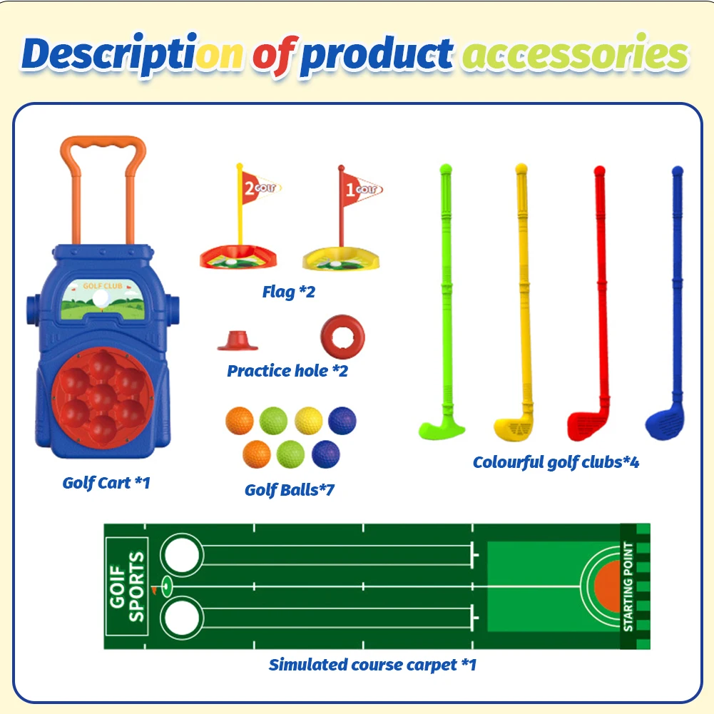 Features: 1.Complete Toddler Golf Set: Includes 4 colorful golf clubs, 7 golf balls, 2 practice holes, 2 flags, 1 simulation course mat, and 1 golf cart. Everything young golfers need for a fun and authentic golfing experience. 2.Portable and Easy to Store: The kids golf set features a wheeled golf cart design for convenient transport and storage. for indoor and outdoor play, kids can enjoy true golfing fun anywhere. 3.Encourages Physical Activity: Promotes hand-eye coordination, concentration, and motor skills development. A great way to foster a love for sports and keep children active. 4.Safe and Non-toxic Materials: Made from high-quality plastic ensuring safety and durability for children aged 3-14 and above. Ideal for parents looking for a worry-free, eco-friendly golf toy. 5. Gift for Holidays and Birthdays: An ideal choice for Christmas, birthdays, or any special occasion. An excellent gift for kids who love outdoor activities and sports.Specification: Size: 330.00×240.00×100.00mm/12.99×9.45×3.94inch Material: Plastic Note: