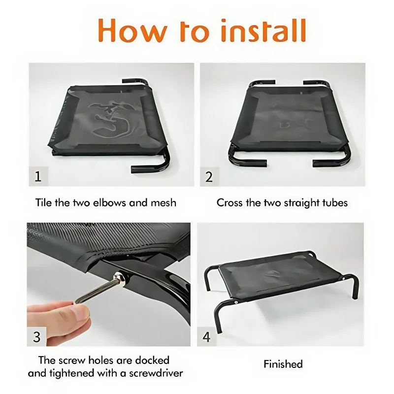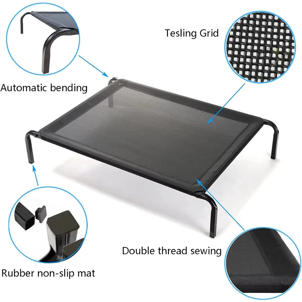 – This elevated folding pet bed is equipped with waterproof and breathable mesh, with black steel frame.