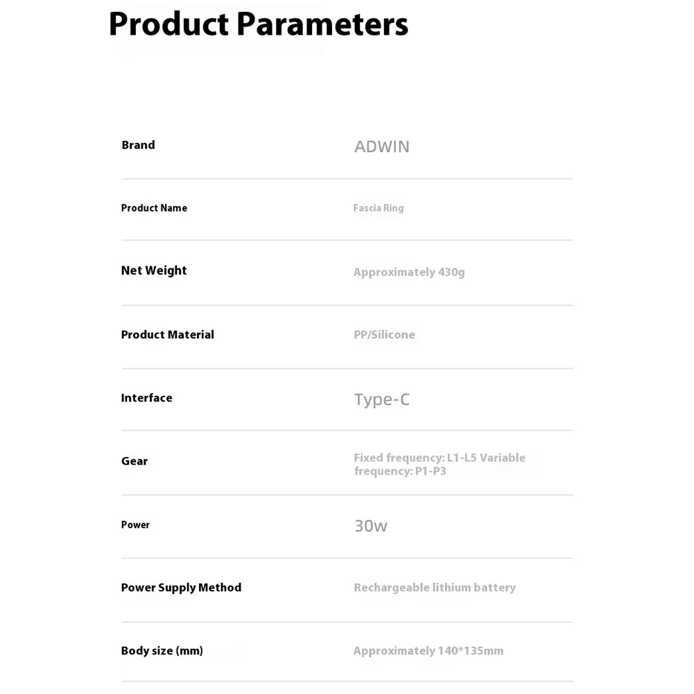 Full-Body Fascia Ring Multifunctional with 5 Modes Deep Tissue Massage Gun Percussion Muscle Massager Vibration Fascial Ring for Home Gym Use Features: 1.Deep Tissue Relief: The handheld fascial ring offers deep tissue massage that conforms to body contours, providing soothing relief for legs, back, waist, and shoulders, making it an excellent choice for those seeking targeted relaxation. 2.Five Intensity Modes: Choose from 5 adjustable vibration intensities with this percussion muscle massager, allowing users to customize the electric massager to suit specific muscle needs across various body parts. 3.Ergonomic Design: The back vibration fascial ring features an ergonomic ring design with a vibrating function and a clear LED screen for easy parameter adjustments, enhancing user experience and convenience. 4.Rechargeable On-the-Go: This electric massager is easily rechargeable and wireless, with a simple button to select your preferred mode, for home, gym, or travel use. 5.Multi-Purpose Application: Designed for versatility, this device targets multiple body areas, including abs, waist, hips, arms, legs, and back, offering comprehensive care. Specification: Note: