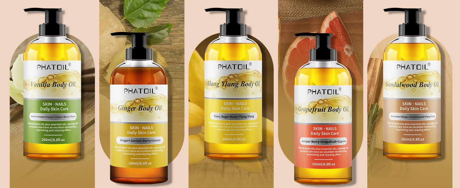 PHATOIL 260ml Body Oil For Skin Care Massage Oil Vanilla Ginger Grapefruit Basil Lavender Rosemary Rose Fragrance Body Oils: 3 – 5 Days Free Delivery Only UK