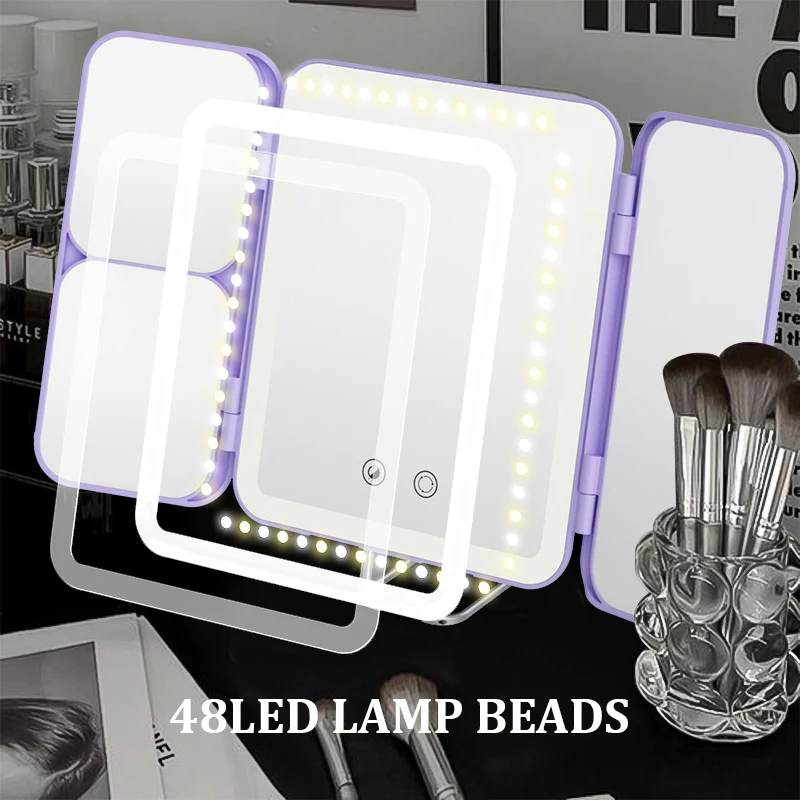 The color of the lighted makeup mirror is white, one of the most popular colors of the female. The tri-fold lighted makeup mirror, featuring one of the brightest lighted mirrors with LED light, tri-fold makeup mirror has an adjustable brightness that can be used to accommodate your lighting needs. Hold the touch screen switch 3s can make the lights dim or bright. The makeup mirror can be rotatable that can be held at the angle you needed.