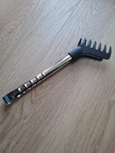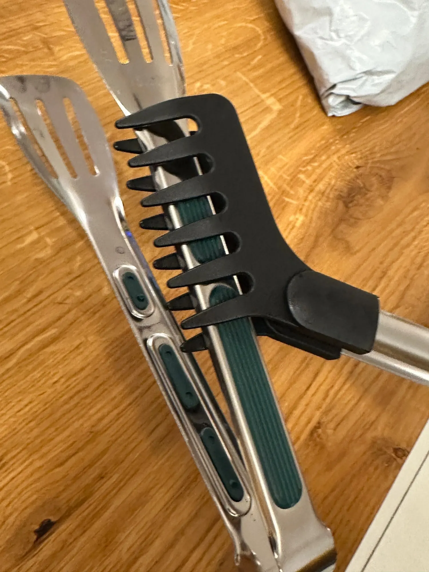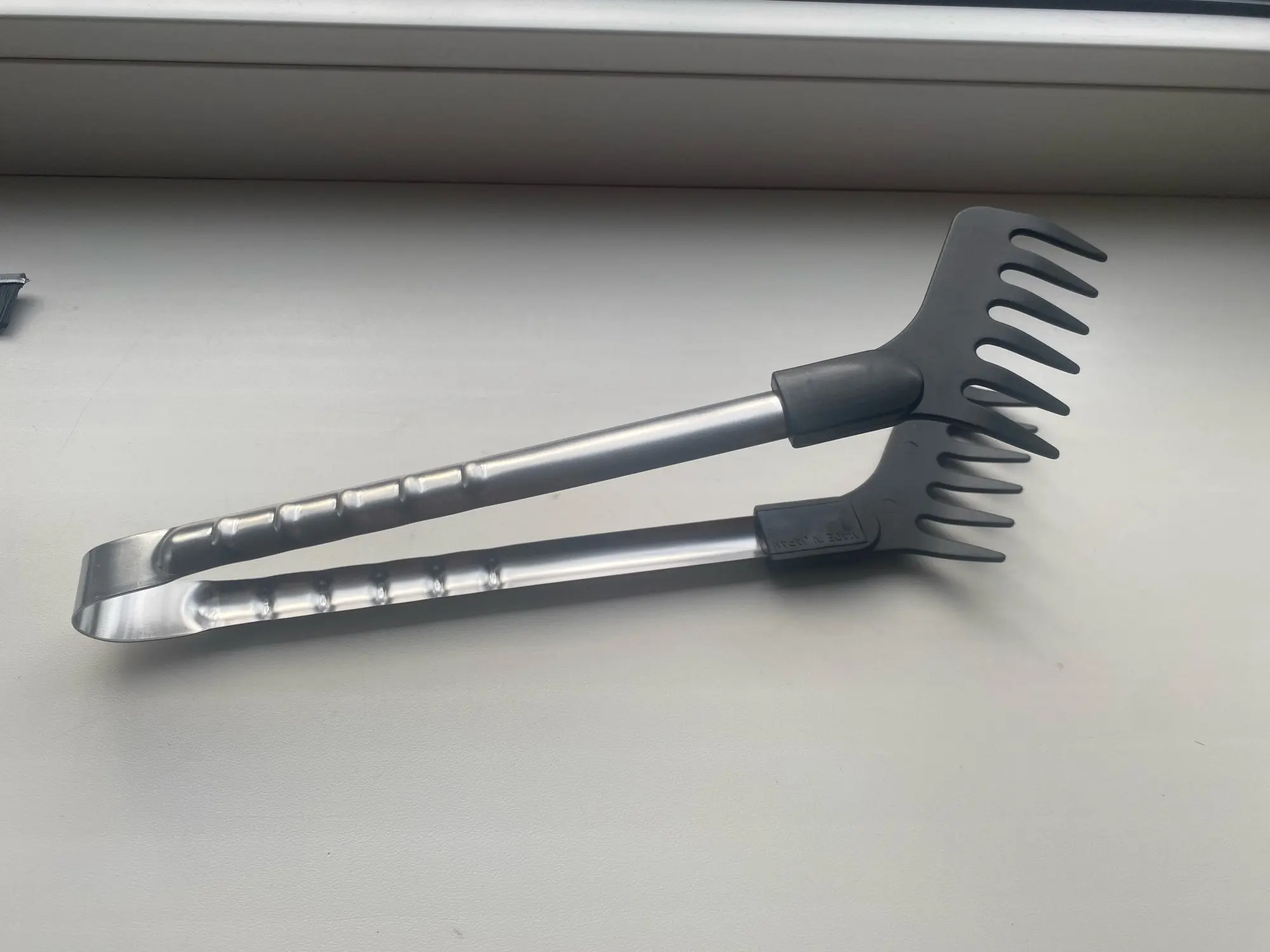 This Pliers is convenient. The plastic forks do not scratch the pan.