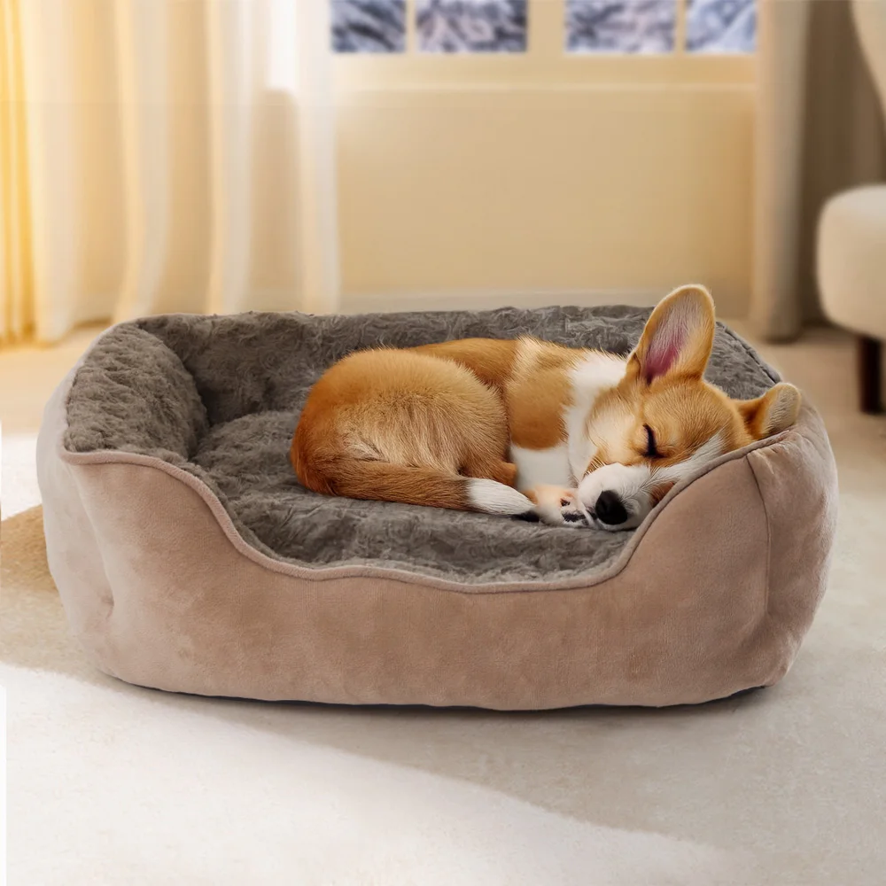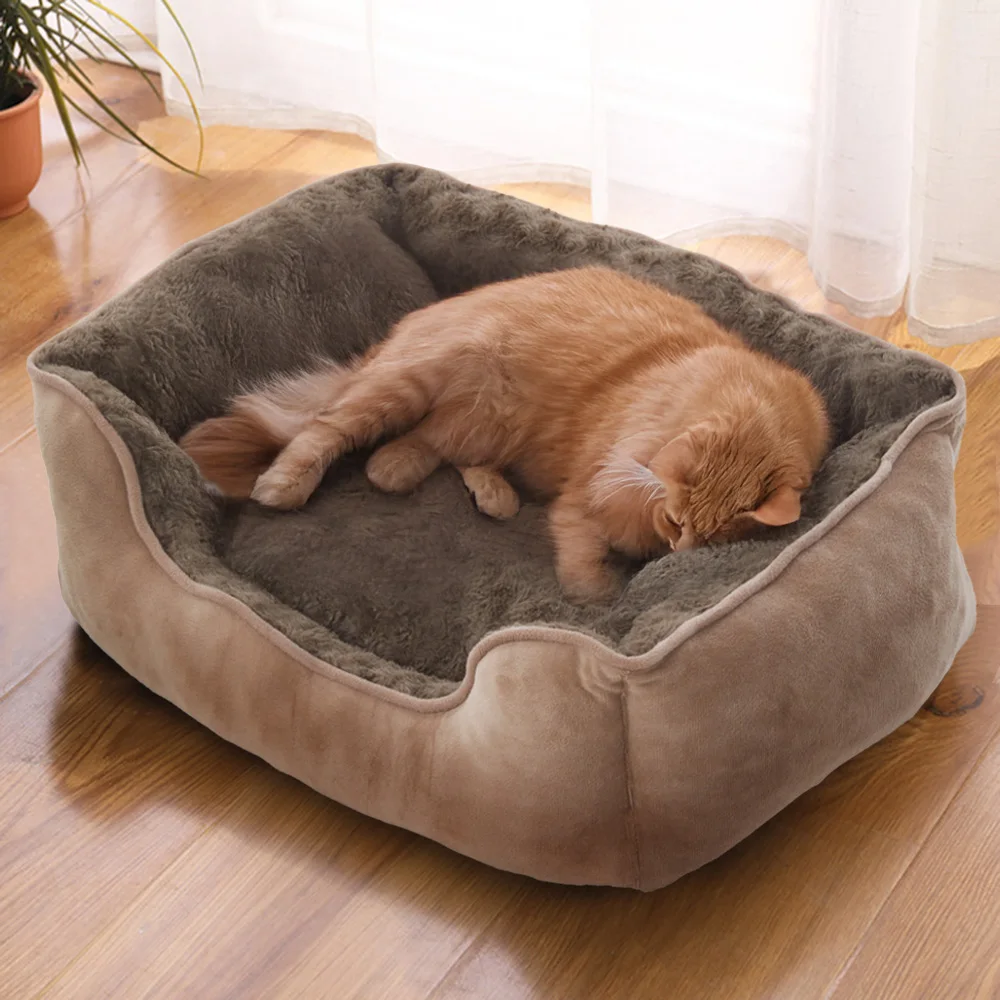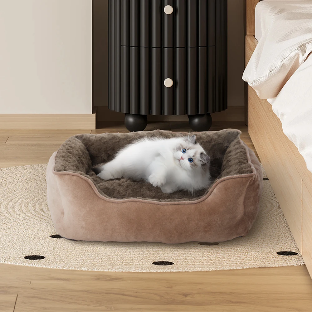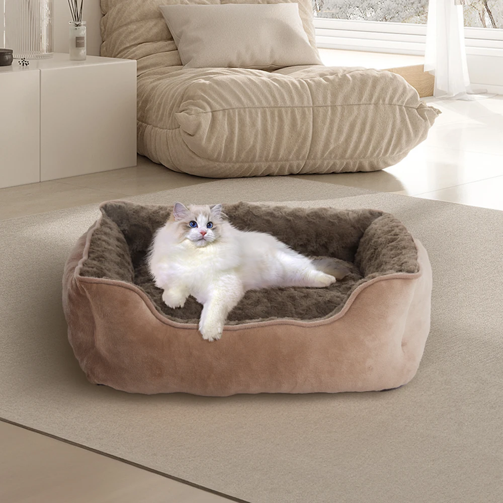 The pet bed is covered in rose-swirl short faux plush and cozy soft velvet fabric, keeping pets warm and comfortable during winter while effectively retaining body heat. The outer fabric is scratch-resistant and durable, ensuring long-lasting use. The raised walls and pillow-like rectangular shape not only give pets a sense of security but also provide excellent support and cushioning for their heads and necks. The bottom is filled with thick and soft PP cotton, ensuring your furry friend stays comfortable and insulated from cold floors. Whether lounging during the day or sleeping at night, this bed offers an ideal resting space for your pet.