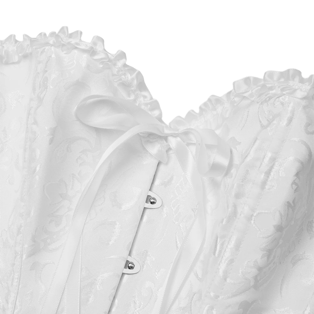 Embrace vintage glamour with our elegant corset top! Intricate jacquard patterns give it a timeless, sophisticated look. Delicate lace trims the neckline and hem, adding a feminine touch. The sweet bow detail at the bust is both charming and elegant. Plus, it features flexible plastic boning, providing comfortable support and helps maintain its shape without restricting movement. Wear it regularly to improve your posture too. Perfect for everyday wear, adding a touch of elegance to any outfit. Dress it up for parties or special occasions, or use it to complete a vintage-inspired costume!