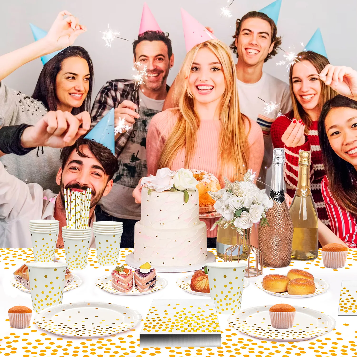 Our white and gold party supplies feature a classic golden dot design. If your friends are preparing for a golden birthday party, this gold disposable plates sets for party is a good gift.