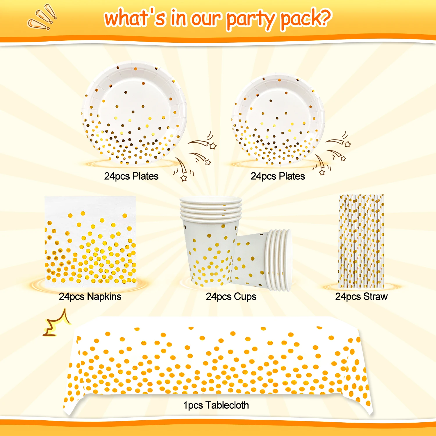 Gold and white party decorations dinnerware sets includes: An oversized tablecloth, 24 x 9 inch gold and white paper plates, 24 x 7 inch white and gold paper plates, 24 x 12oz white gold party paper cup, 24 white and gold straw etc 121 pcs white gold party supplies in total.