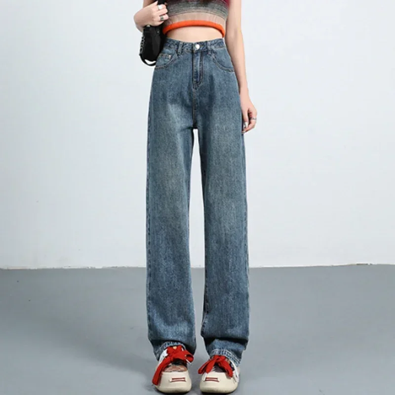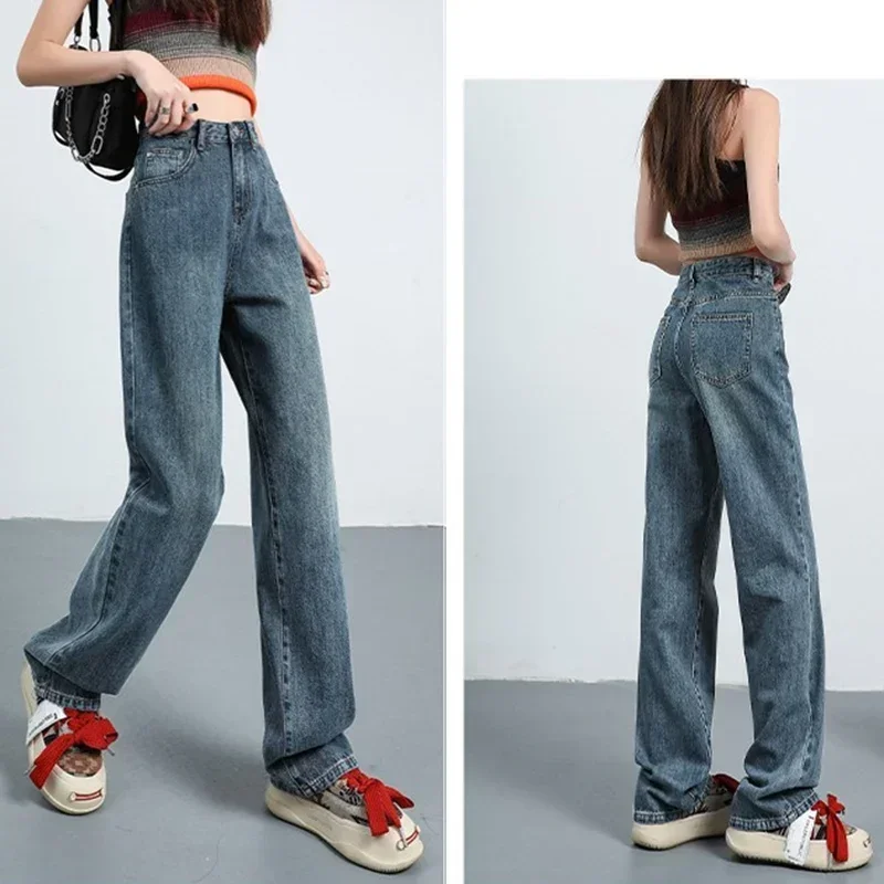 Women Retro Blue Black High Waist Wide Leg Jeans Lady Korean Style Straight Leg Denim Pants Fashion Streetwear Daily Trousers