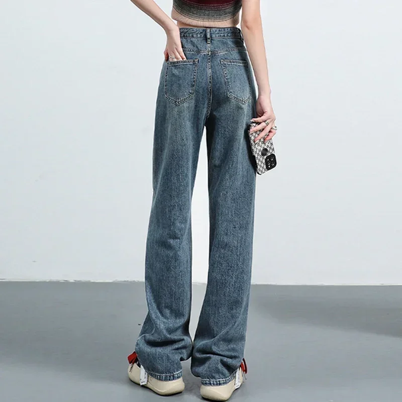 Women Retro Blue Black High Waist Wide Leg Jeans Lady Style Straight Leg Denim Pants Fashion Streetwear Daily Trousers
