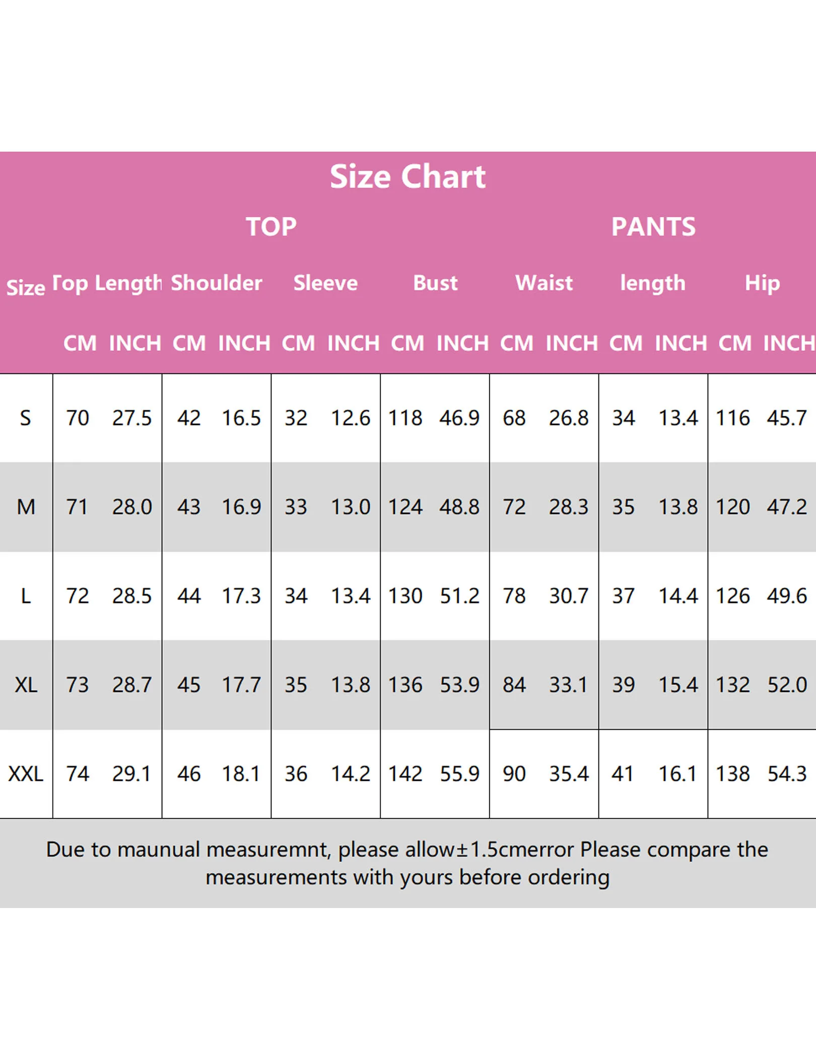 Please allow a 1-2 cm difference in measurements due to manual measuring.