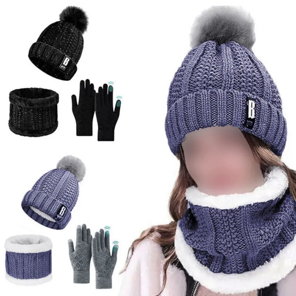 This is a set of winter necessities. Warm knitted hat, round scarf and sensitive touch screen golve for outdoor sports. Protect your head, neck and hand from the wind in cold winter to ensure maximum warmth.
